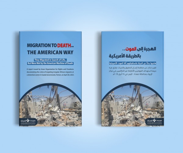 A report issued by Insan Organization for Rights and Freedoms, documenting the crime of targeting irregular African migrants at a detention center in Saada Governorate, Yemen, on April 28, 2025