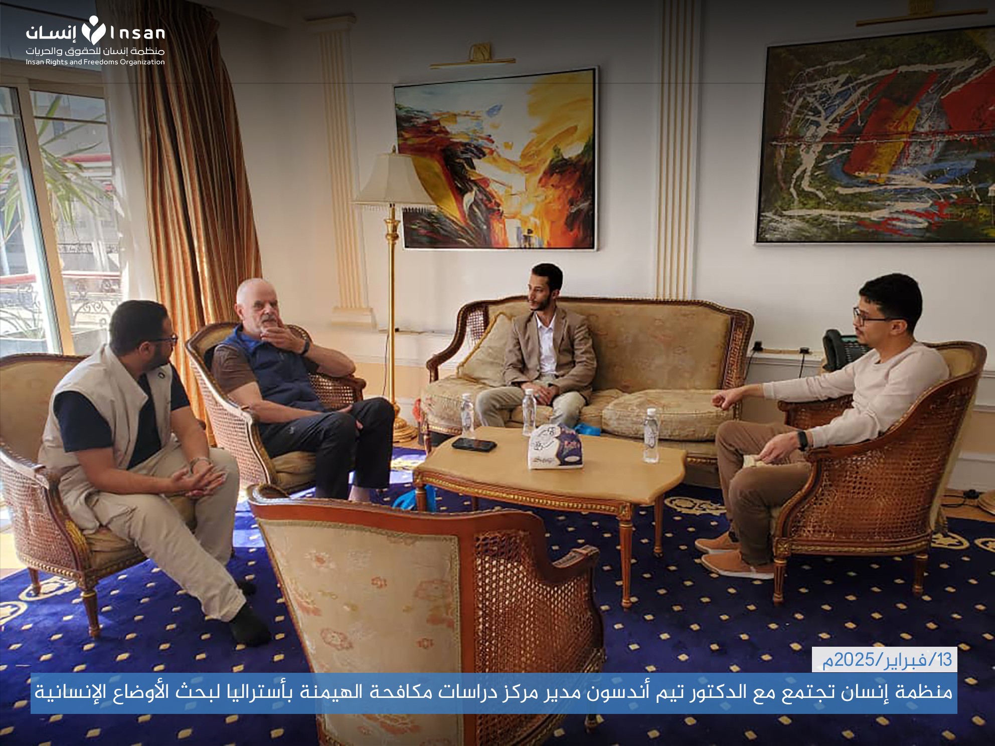 في إطار جهودها لتعزيز الوعي الحقوقي والإنساني، التقى فريق من منظمة "إنسان للحقوق والحريات" بالدكتور تيم أندرسون، مدير مركز دراسات مكافحة الهيمنة، وذلك في مقر إقامته بالعاصمة اليمنية صنعاء.
