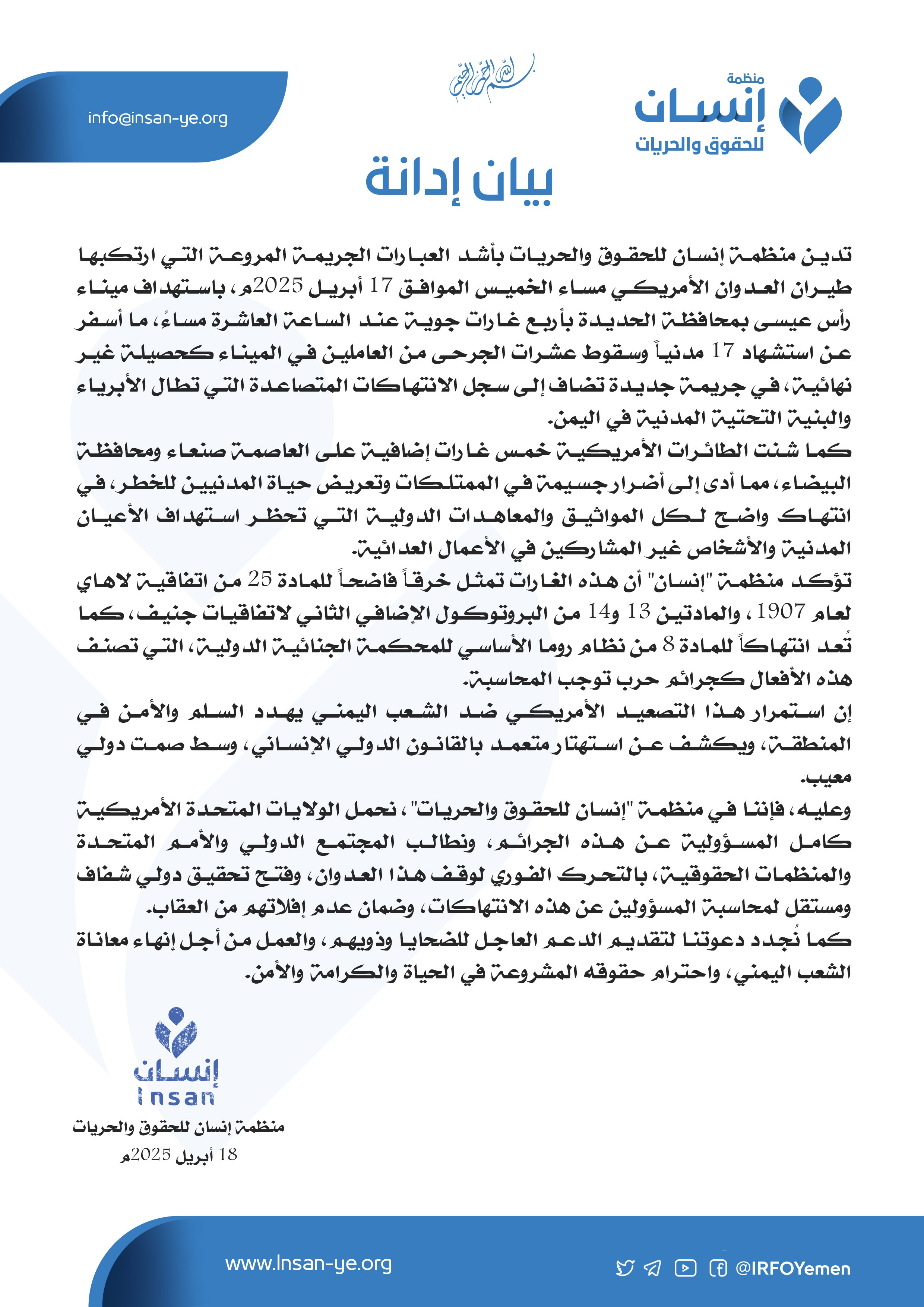 تدين منظمة "إنسان للحقوق والحريات" بأشد العبارات الجريمة المروعة التي ارتكبها طيران العدوان الأمريكي مساء الخميس الموافق 17 أبريل 2025م، باستهداف ميناء رأس عيسى بمحافظة الحديدة بأربع غارات جوية عند الساعة العاشرة مساءً، ما أسفر عن استشهاد 17 مدنياً وسقوط عشرات الجرحى من العاملين في الميناء كحصيلة غير نهائية، في جريمة جديدة تضاف إلى سجل الانتهاكات المتصاعدة التي تطال الأبرياء والبنية التحتية المدنية في اليمن.