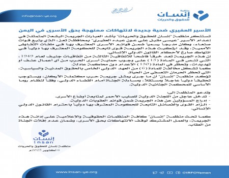 كما نُجدد دعوتنا لتقديم الدعم العاجل للضحايا وذويهم، والعمل من أجل إنهاء معاناة الشعب اليمني، واحترام حقوقه المشروعة في الحياة والكرامة والأمن.