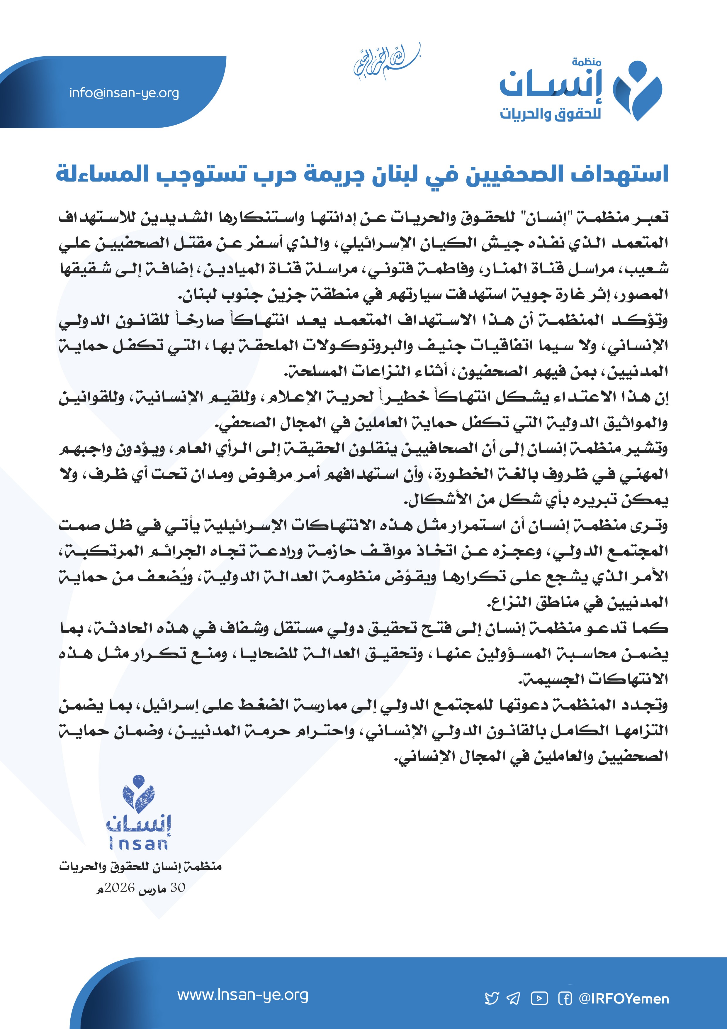 Insan Organization for Rights and Freedoms expresses its strong condemnation and denunciation of the deliberate attack carried out by the Israeli occupation forces, which resulted in the killing of journalist Ali Shuaib, correspondent for Al-Manar TV, and Fatima Ftouni, correspondent for Al-Mayadeen TV, along with her brother, a cameraman, following an airstrike that targeted their vehicle in the Jezzine area in southern Lebanon.