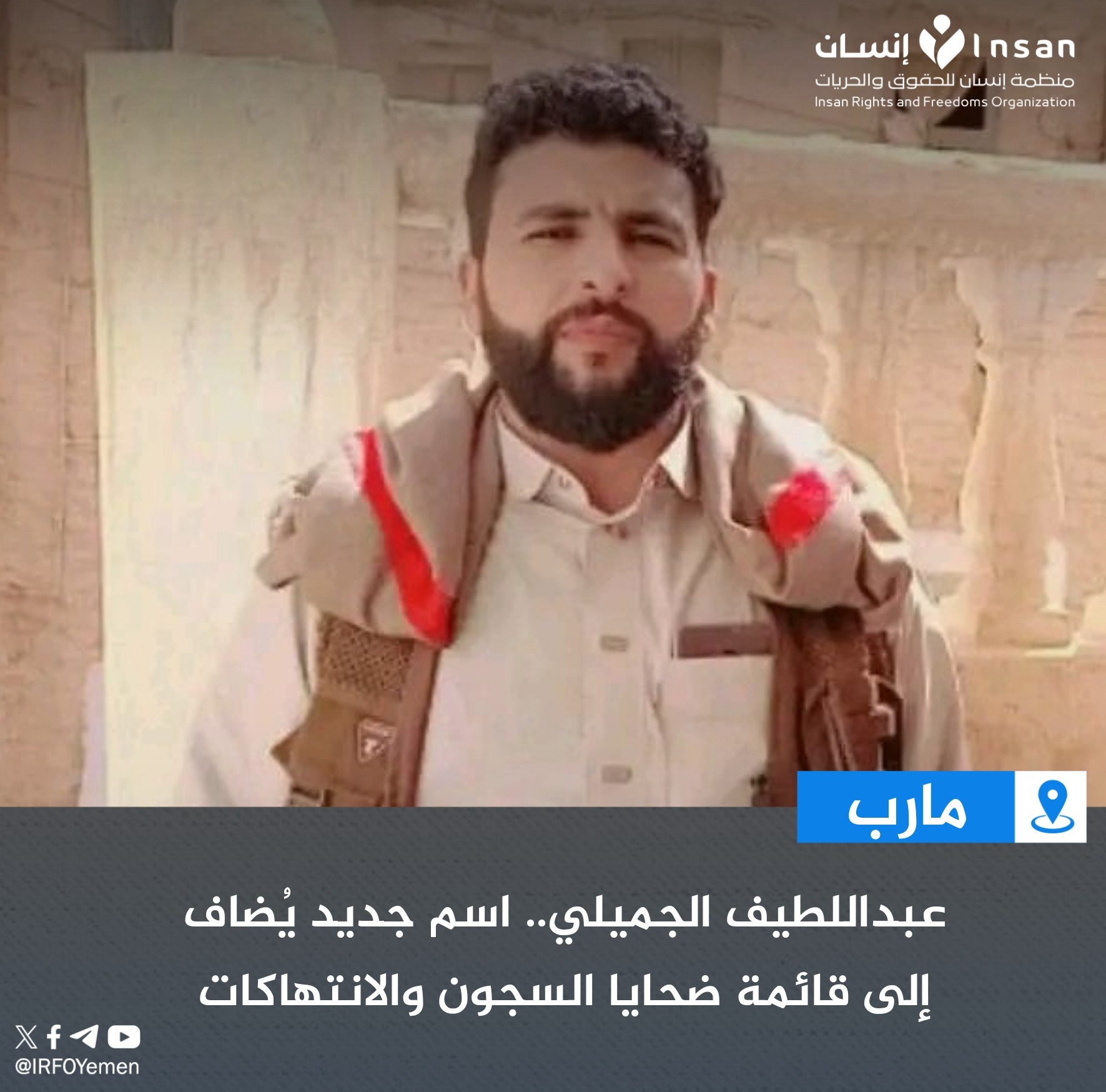 في حادثة صادمة تعكس انتهاكات جسيمة لحقوق الإنسان، عُثر على جثة الشاب عبداللطيف الجميلي ملقاة في أحد شوارع مدينة مأرب، بعد أن قضى أشهراً في سجون الأجهزة الأمنية التابعة للحكومة المعترف بها دولياً.
