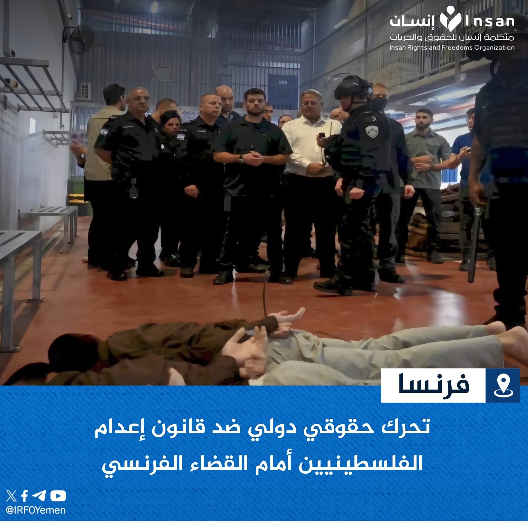 ‏قدم عدد من الحقوقيين شكوى رسمية أمام النيابة العامة في العاصمة الفرنسية باريس ضد رئيس حكومة الاحتلال الإسرائيلي بنيامين نتنياهو ووزير الأمن القومي إيتمار بن غفير، على خلفية مسؤوليتهما المباشرة في إقرار قانون يجيز إعدام الأسرى الفلسطينيين.
